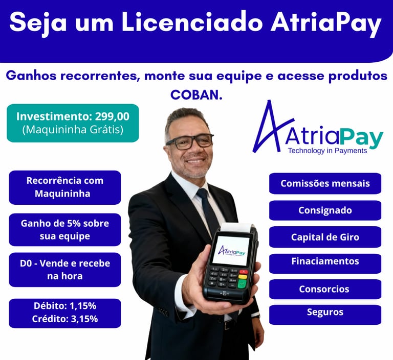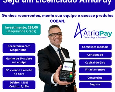 “A AtriaPay é hoje uma das soluções mais completas para MEIs e pequenos negócios. Trabalhamos com as menores taxas do mercado — 1,15% no débito e 3,5% no crédito — com recebimento D0 e máquina grátis sem meta de faturamento. Além disso, oferecemos um portfólio financeiro completo com empréstimos, capital de giro, seguros, consórcios e muito mais. É uma solução que reduz custos, melhora o fluxo de caixa e ainda dá acesso a crédito de forma simples e rápida.”